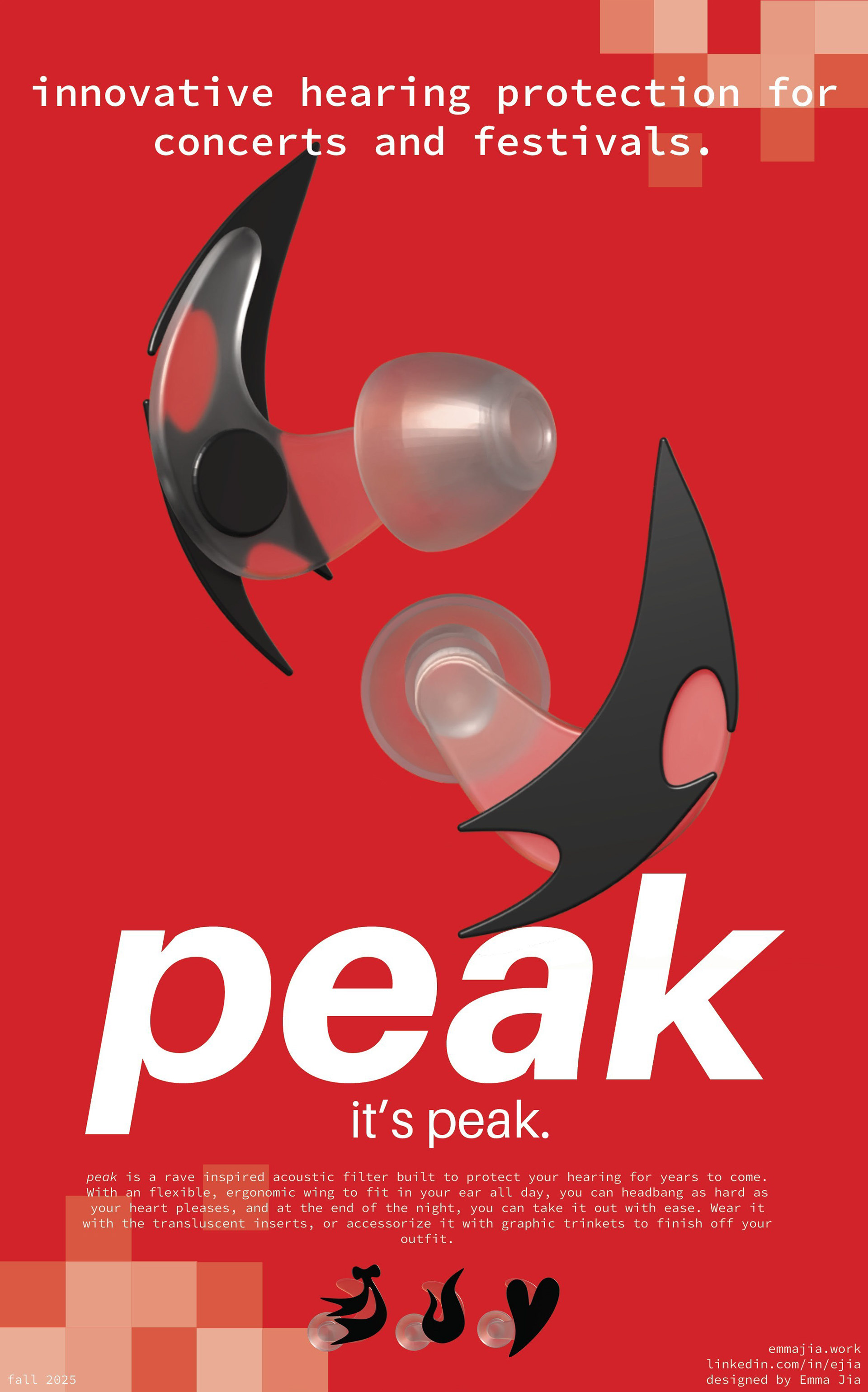 As I continue to develop peak during my capstone, I will focus on creating more trinket designs for accessorizing and presenting the prototype on a real ear.